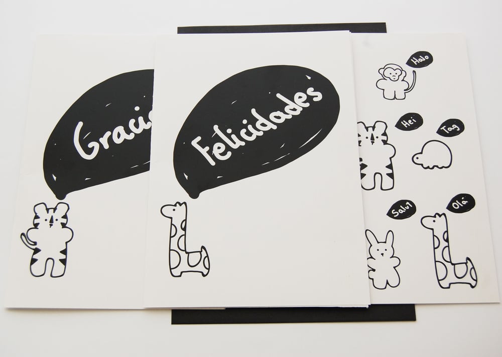 Tres tarjetas en Blanco y Negro para todas las ocasiones, con los animales de nuestra Happy Family. La tarjeta esta en blanco en el interior para que puedas escribir un mensaje muy especial según cada ocasión. Se acompañan de tres sobres negros a juego con las tarjetas listas para regalar.